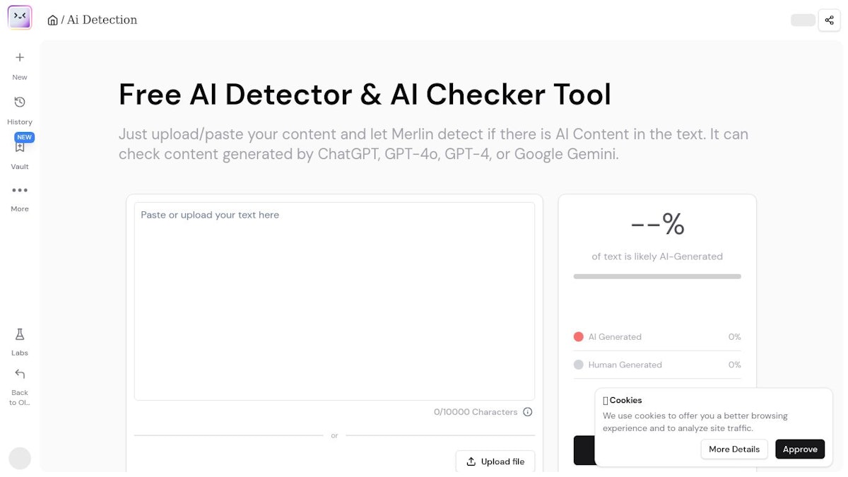 The Merlin AI Detector is a free tool that enables users to upload or paste their content to determine if it contains AI-generated text. It effectively analyzes content generated by ChatGPT, GPT-4o, GPT-4, and Google Gemini with ease, ensuring authenticity and integrity in writing. With no sign-up required, this tool is accessible for anyone seeking to verify the originality of their text.